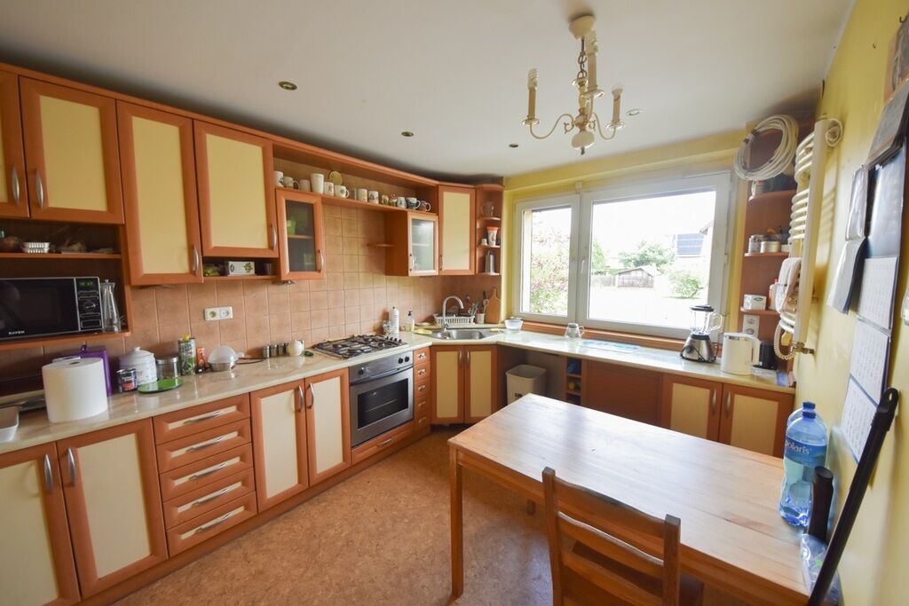 posiada 7 pokoi, 2 kuchnie, 2 łazienki, 2 ubikacje, hol, przedpokoje,