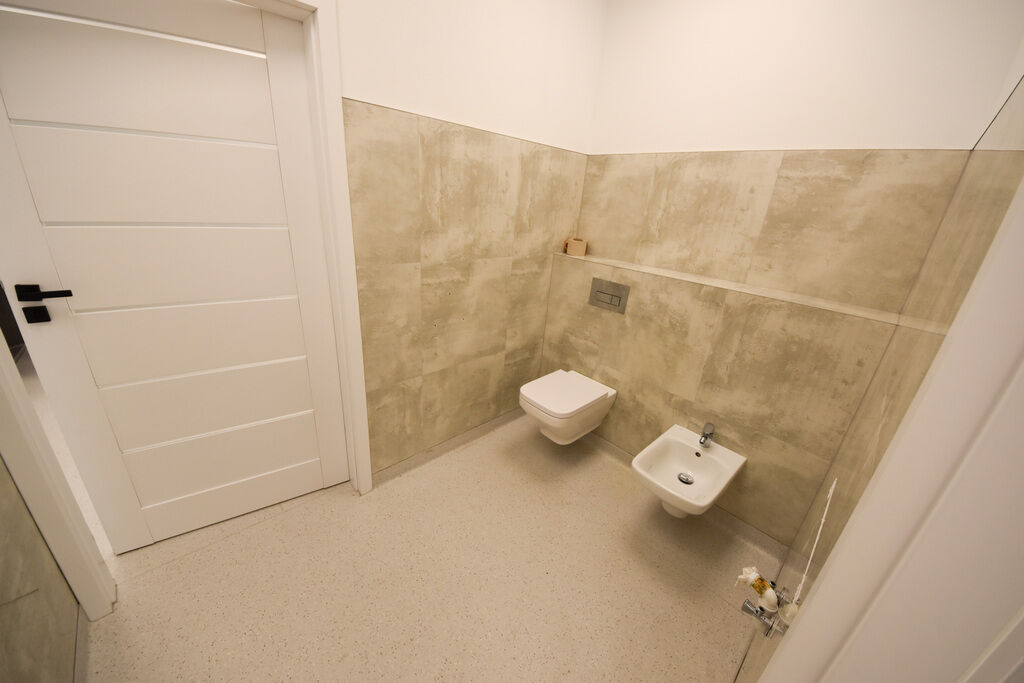 końcu dwa gabinety z jedną wspólną toaletą z bidetem. Wcześniej