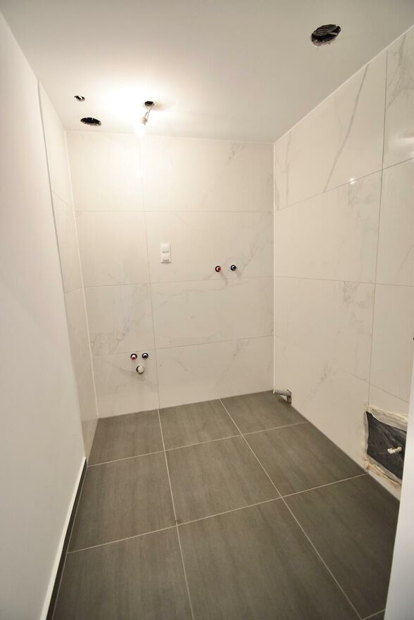 w łazience nowe płytki na ścianach oraz wyprowadzone instalacje pod toaletę, prysznic i umywalkę.