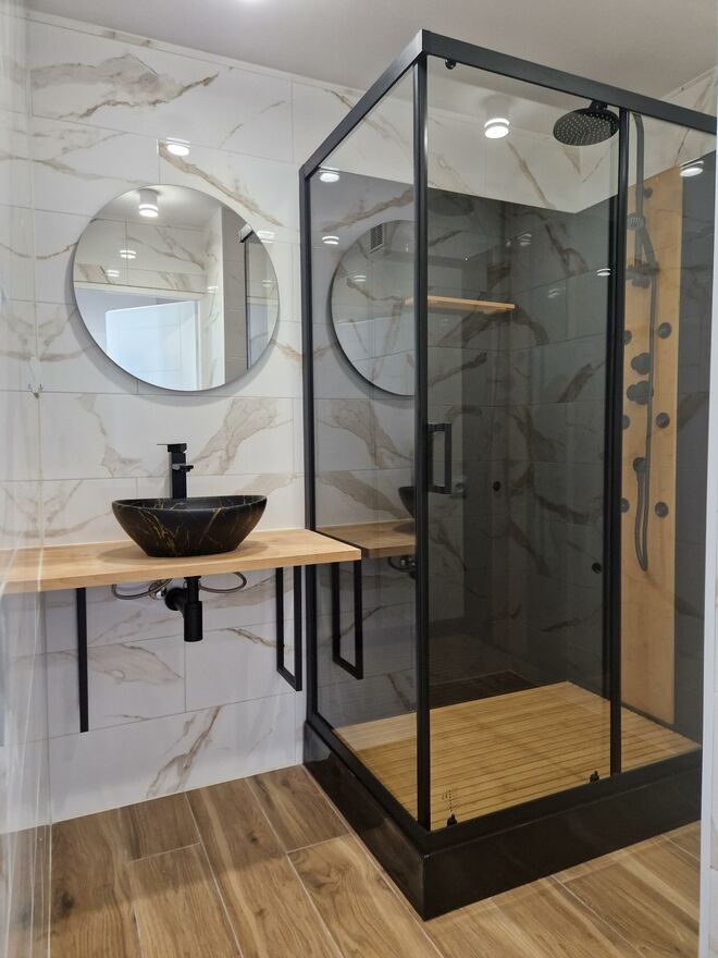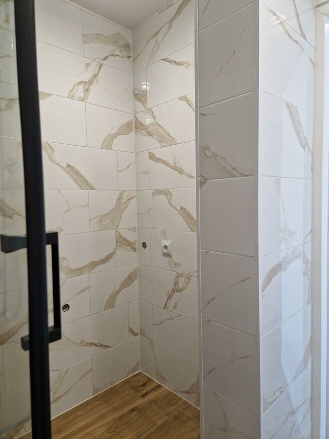 - łazienki z prysznicem z panelem prysznicowym z biczami wodnymi oraz z niewidocznym przy wejściu miejscem na ustawienie pralki a nawet suszarki,