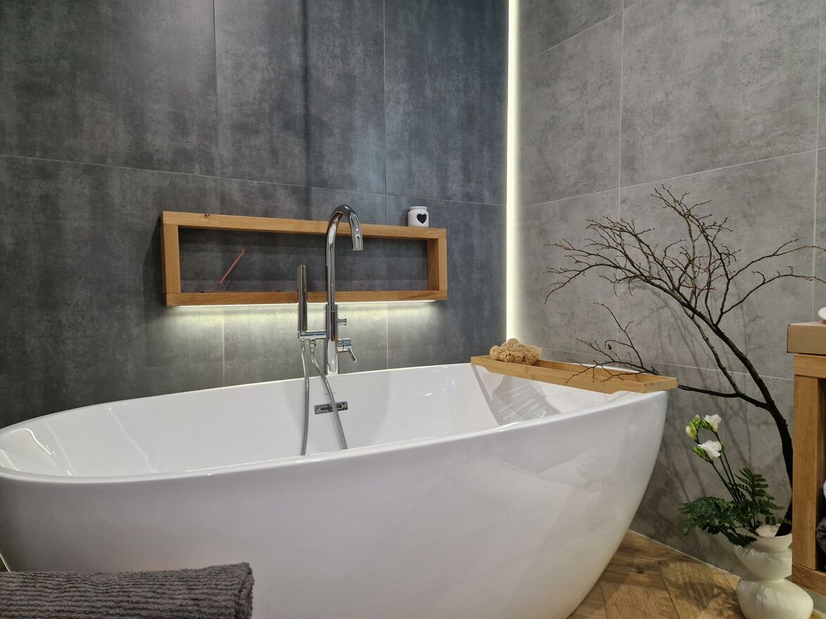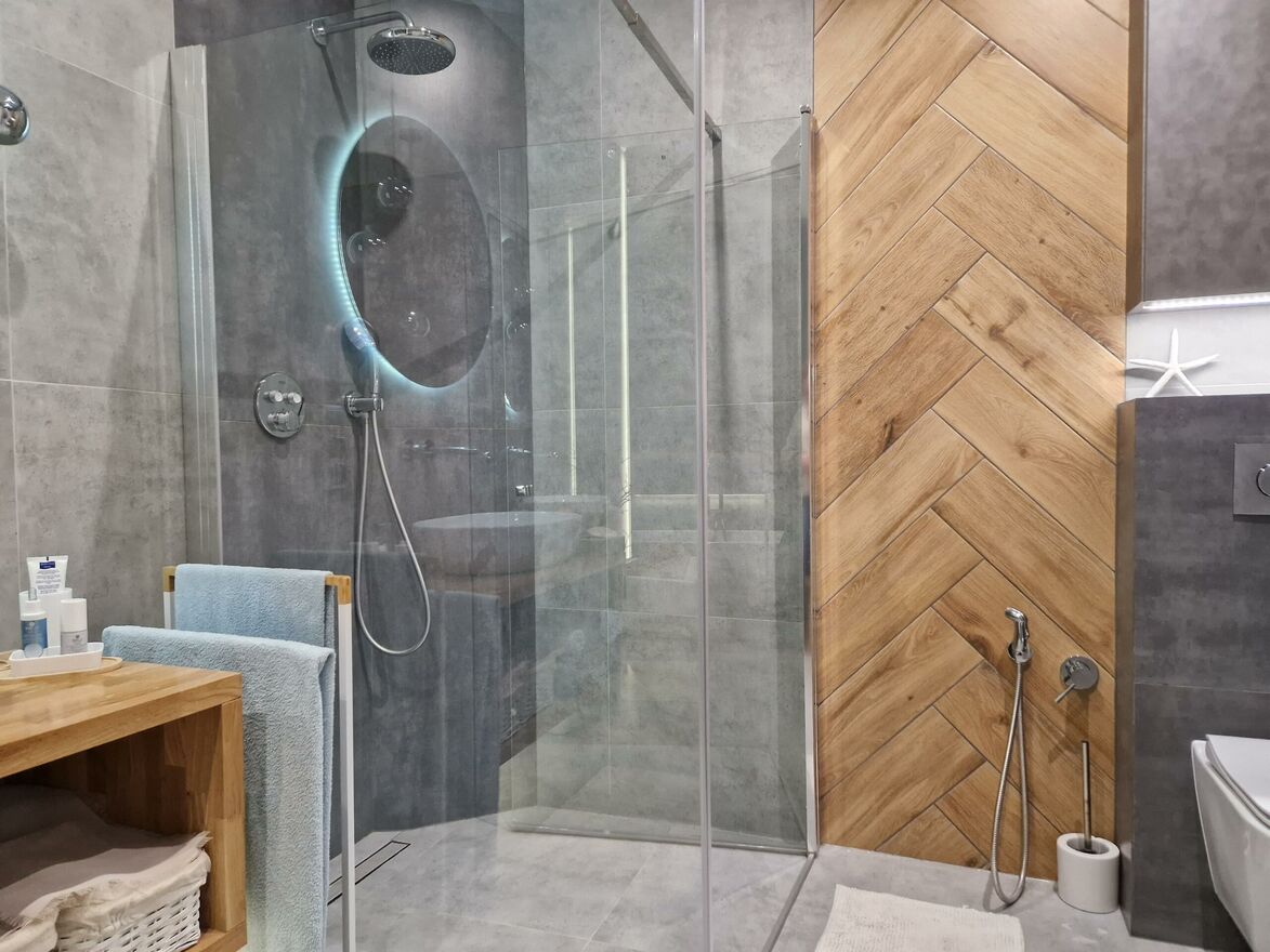 - pokoju kąpielowego z wolnostojącą wanną (domowe SPA), obszernym prysznicem, umywalką połączonego z WC nie widocznym przy wejściu do pomieszczenia. Przy toalecie bidetka,