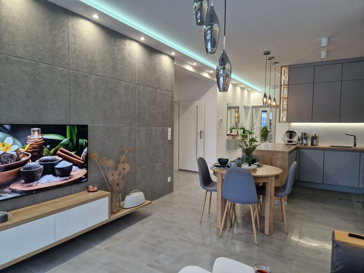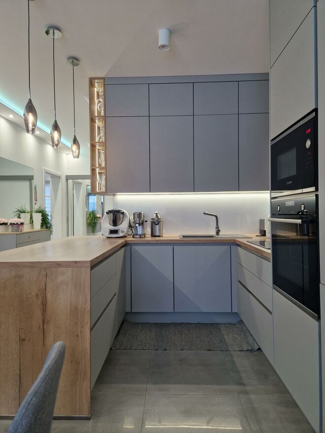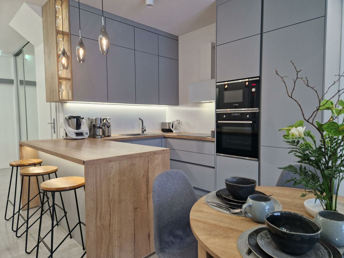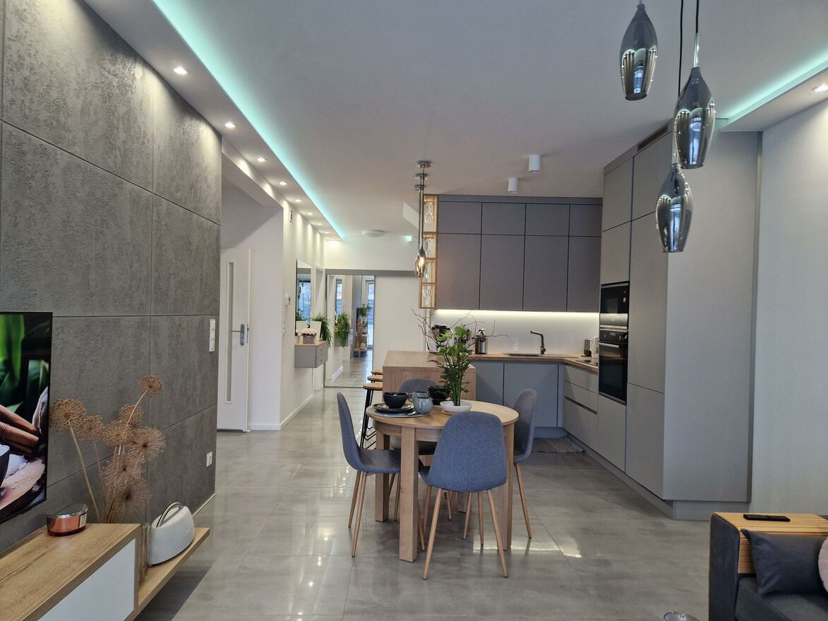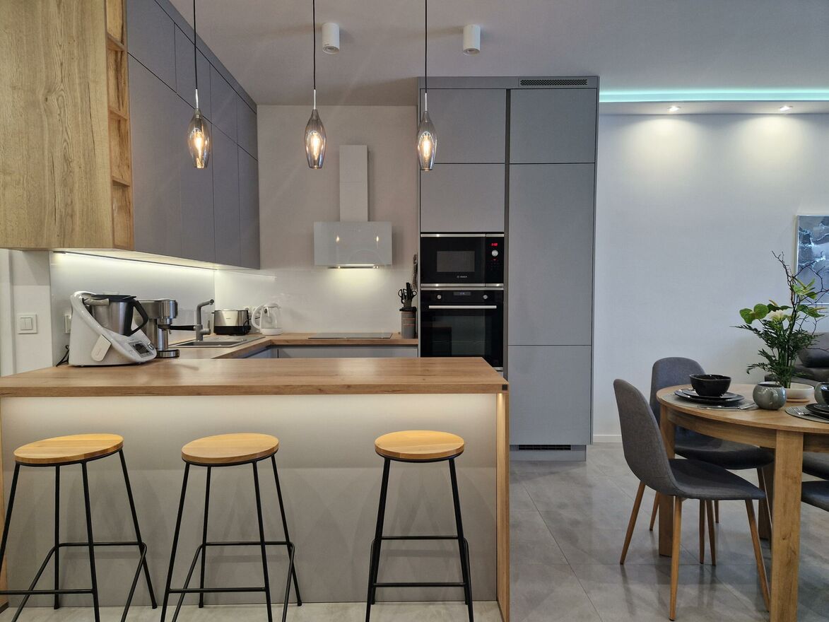 - obszernego salonu z miejscem na postawienie stołu jadalnianego z wyjściem na taras i ogród połączonego z otwartą kuchnią z wykonaną na zamówienie zabudową w kształcie litery C z pełnym osprzętem AGD (lodówko-zamrażarka, zmywarka, płyta indukcyjna, piekarnik, mikrofalówka, pochłaniacz),